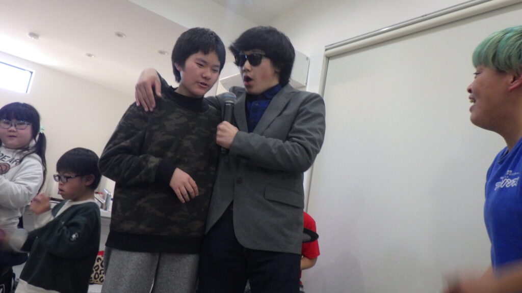 少しずつ楽しい雰囲気につられて前に出てマイクを持って歌ってみたり